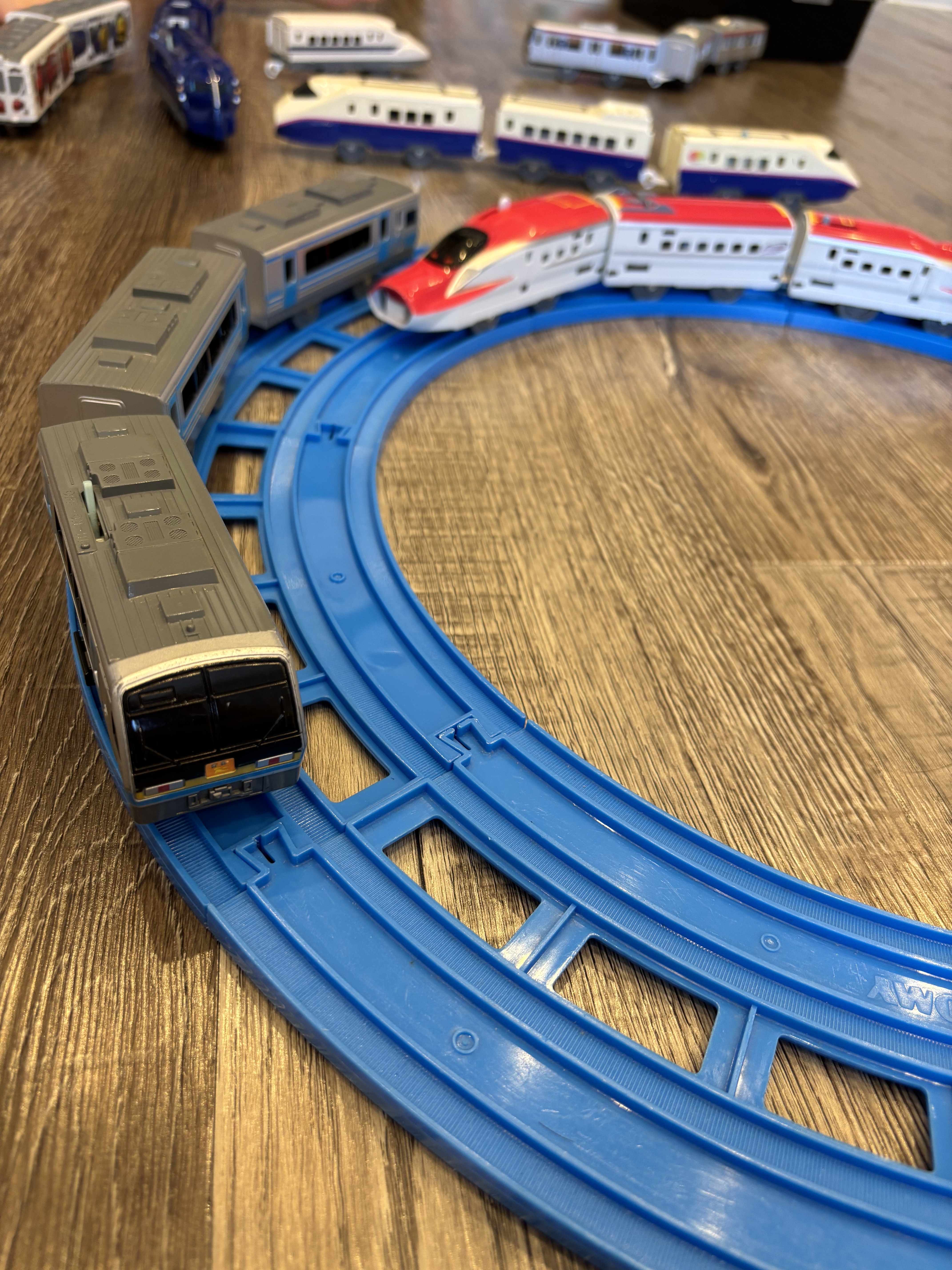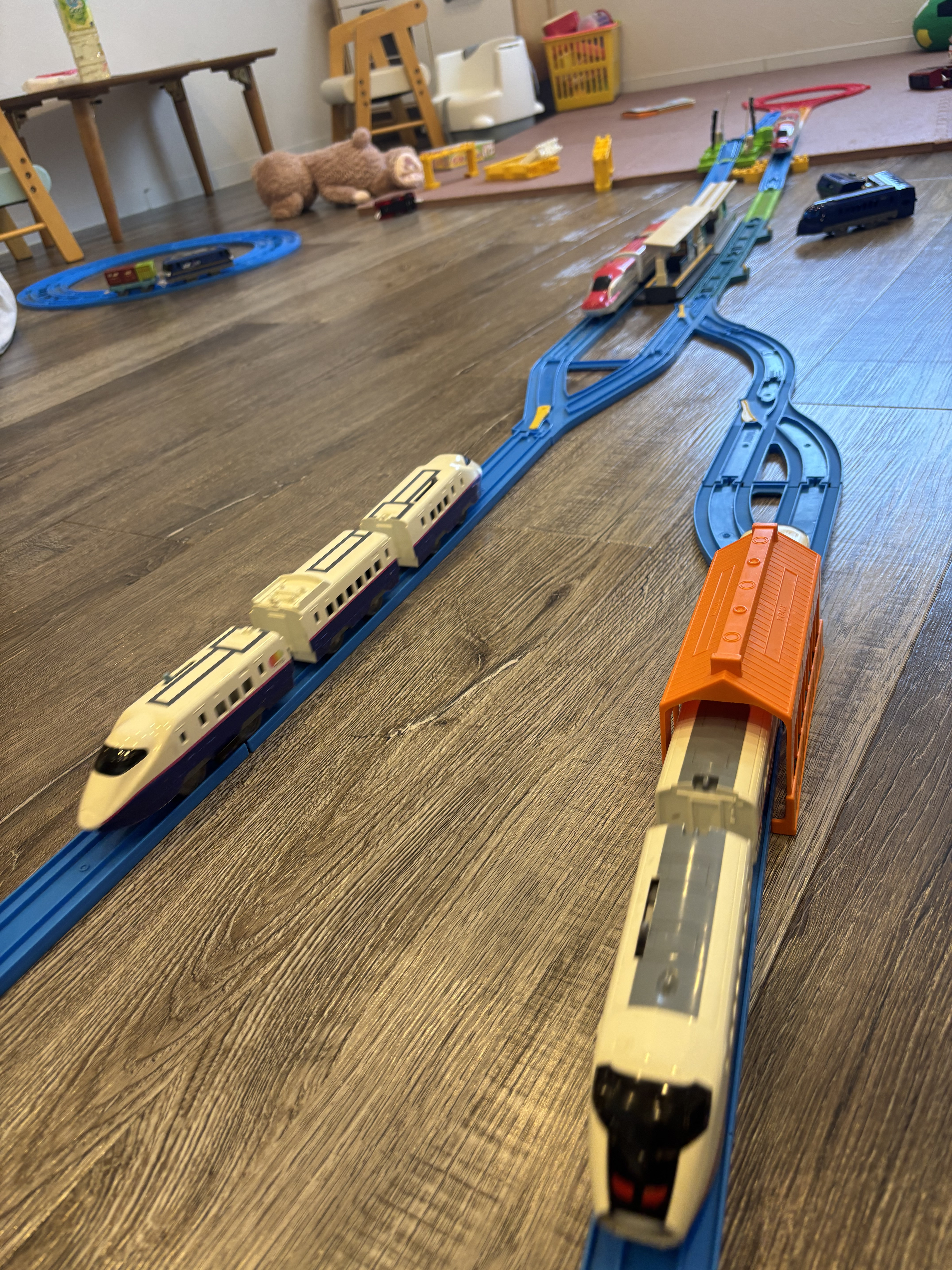 満足がいくレールが出来たら、たくさんの新幹線を走らせて遊びました(*^_^*)!